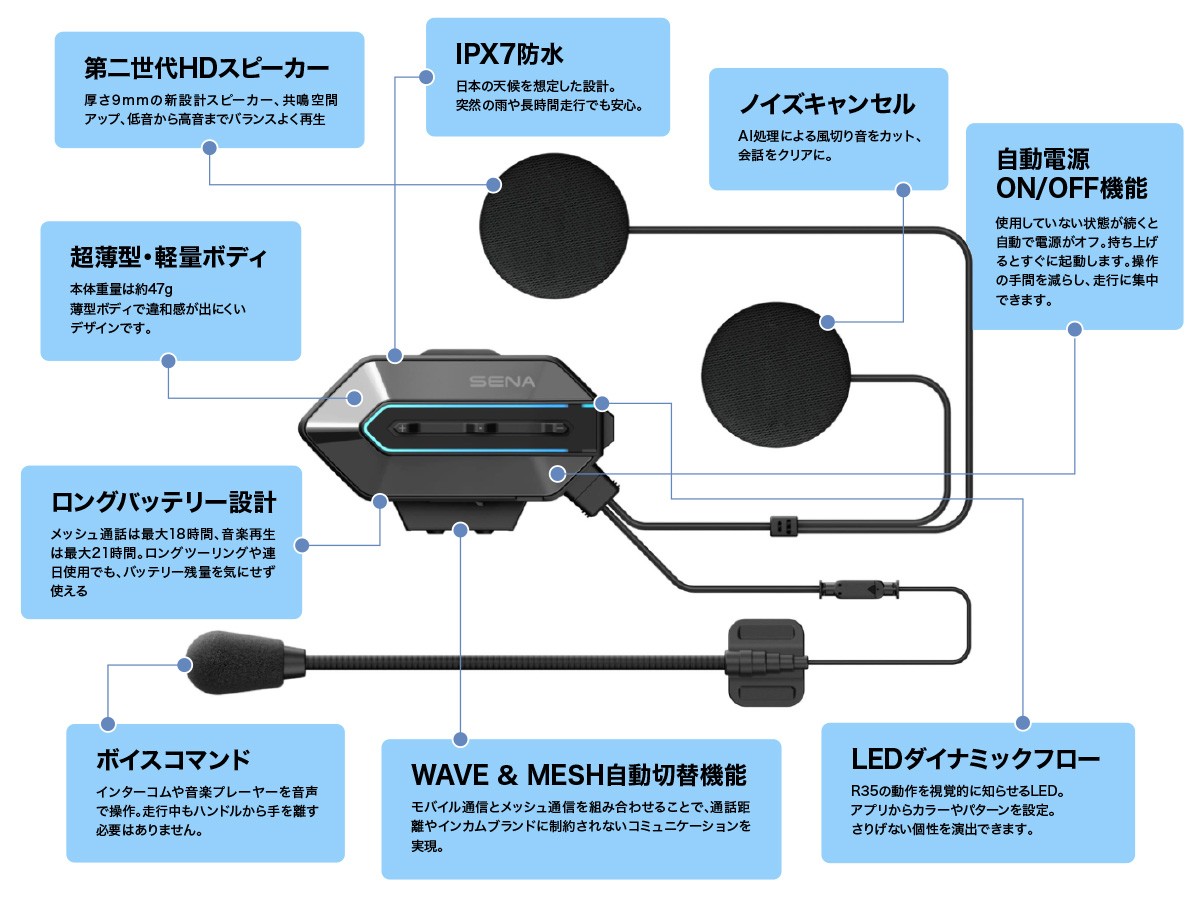 全国のバイクショップにて、「SENA R35」の販売がスタートしました。MESH3.0とWAVEインターコムという、SENAが誇る2つの通話技術を組み合わせたことで、より安定し、より自由度の高いコミュニケーションを実現。シーンに応じて最適な接続方法を選べるのも大きな魅力です。 さらに、第二世代HDスピーカーを搭載し、クリアで臨場感のあるサウンドを実現。会話も音楽も、これまで以上に快適に楽しめます。 SENAの最先端技術を凝縮しながらも、扱いやすいベーシックモデルとして仕上がったR35。これからインカムを始める方にも、買い替えを検討されている方にもおすすめです。 実際の質感や装着感は、ぜひ店頭でお確かめください。 お近くのバイクショップで、SENA R35をチェックしてみてください。