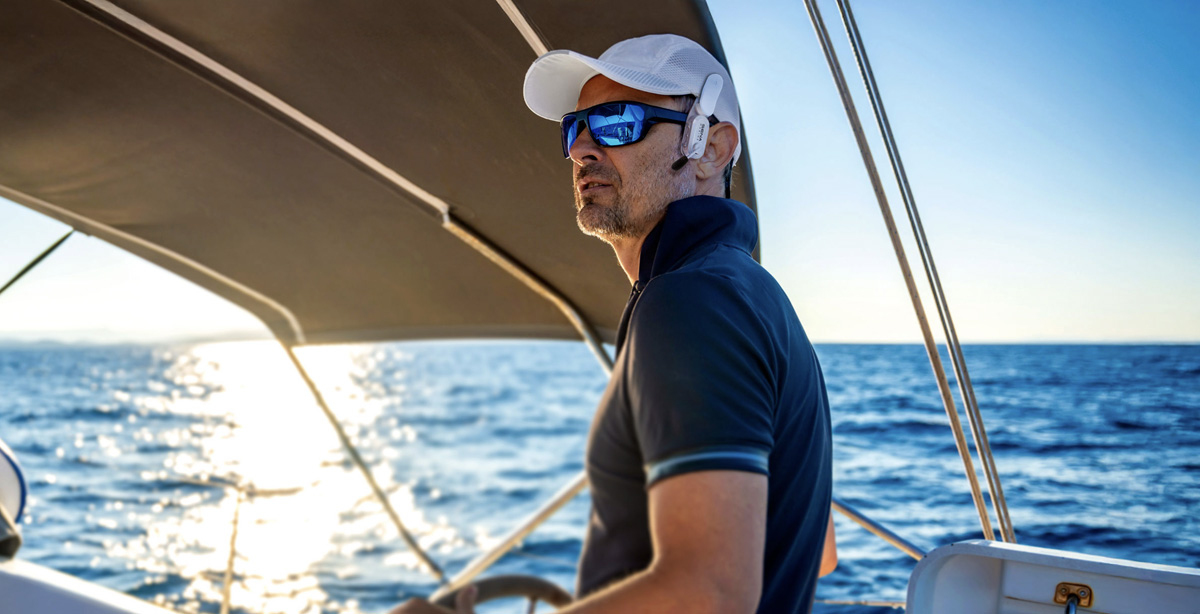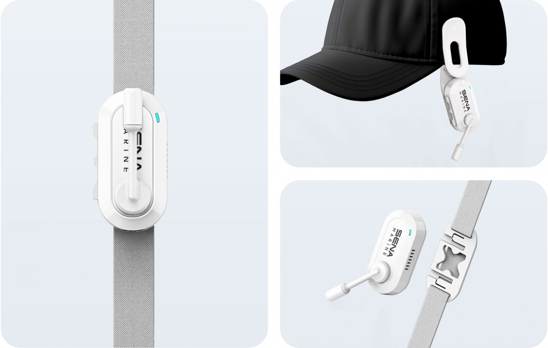 キャップや海上用ヘルメットのストラップに簡単に取り付けて使用できる、片耳タイプの軽量ヘッドセットとして設計。
