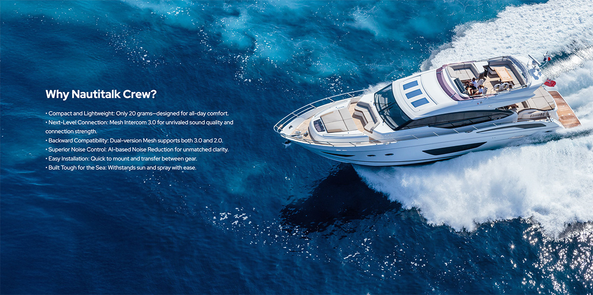過酷なマリン環境に耐えうるよう設計されたNautitalk Crewは、耐久性に優れたUV耐性素材と防水性能を備えています。