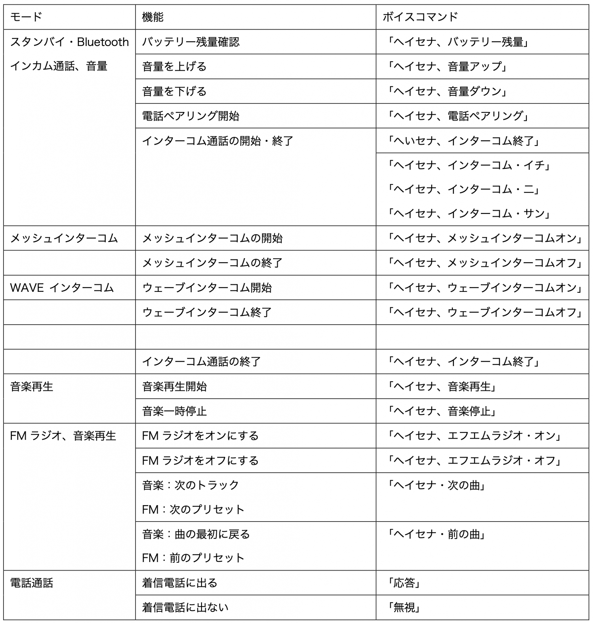 ・ボイスコマンドは、環境によりうまく機能しないときがあります。本機能は、風切り音や他のノイズがあまりマイクに入らない環境でお使いください。