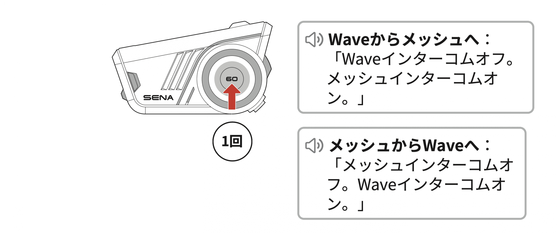 通話中、ジョグダイヤルを1回タップすると、簡単にメッシュインターコムとWAVEインターコムの切り替えができます。