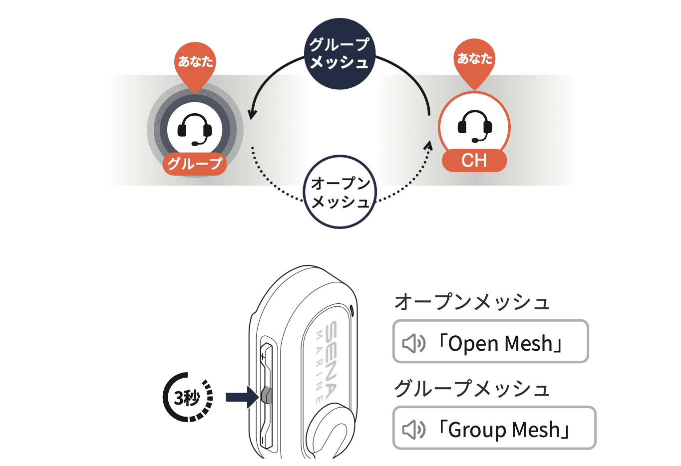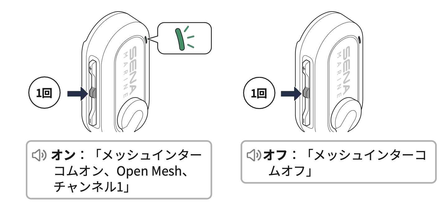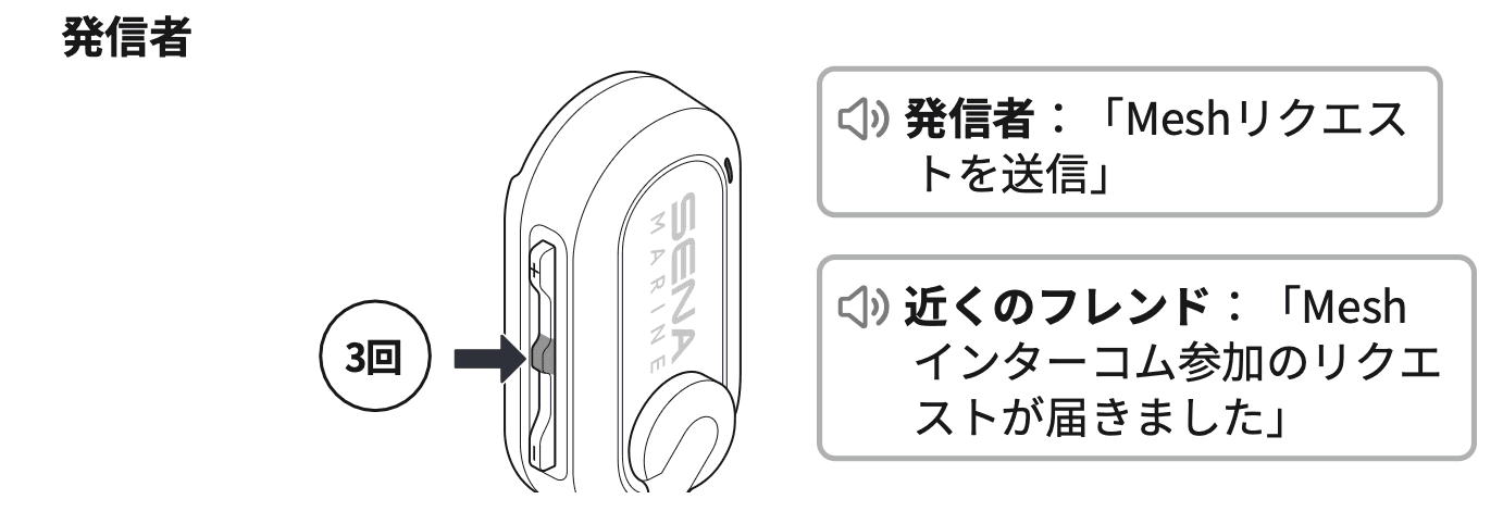 1. 本メッセージを送受信するには、まずSena Marine Appのデバイス設定から、「メッシュリクエスト機能」をオンにしてください。