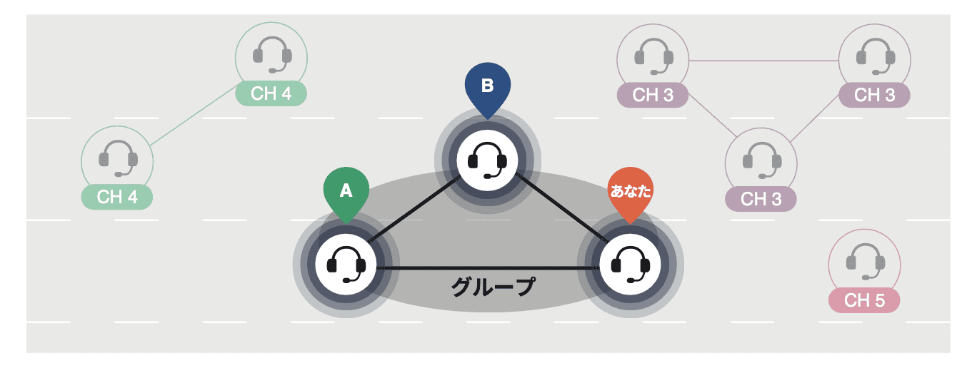 上図のCとDを新たにグループに追加するには、グループ内の一人(あなた)、およびCとDのセンターボタンを5秒長押ししてグループ作成をすれば、CとDは既存のグループ(A,B,あなた)に参加することができます。