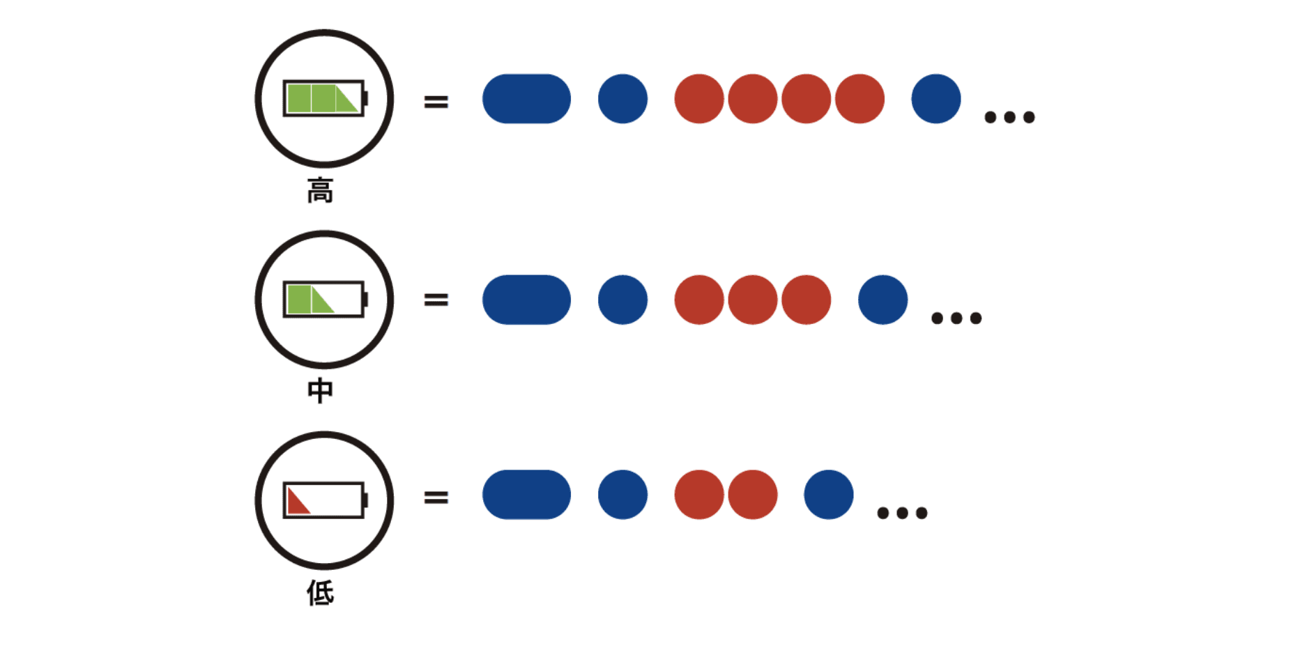 1. 電源オンの時の赤色LEDの点滅回数で、バッテリー残量を確認できます。赤色LEDが4回点滅するときは、バッテリー残量が十分あります。