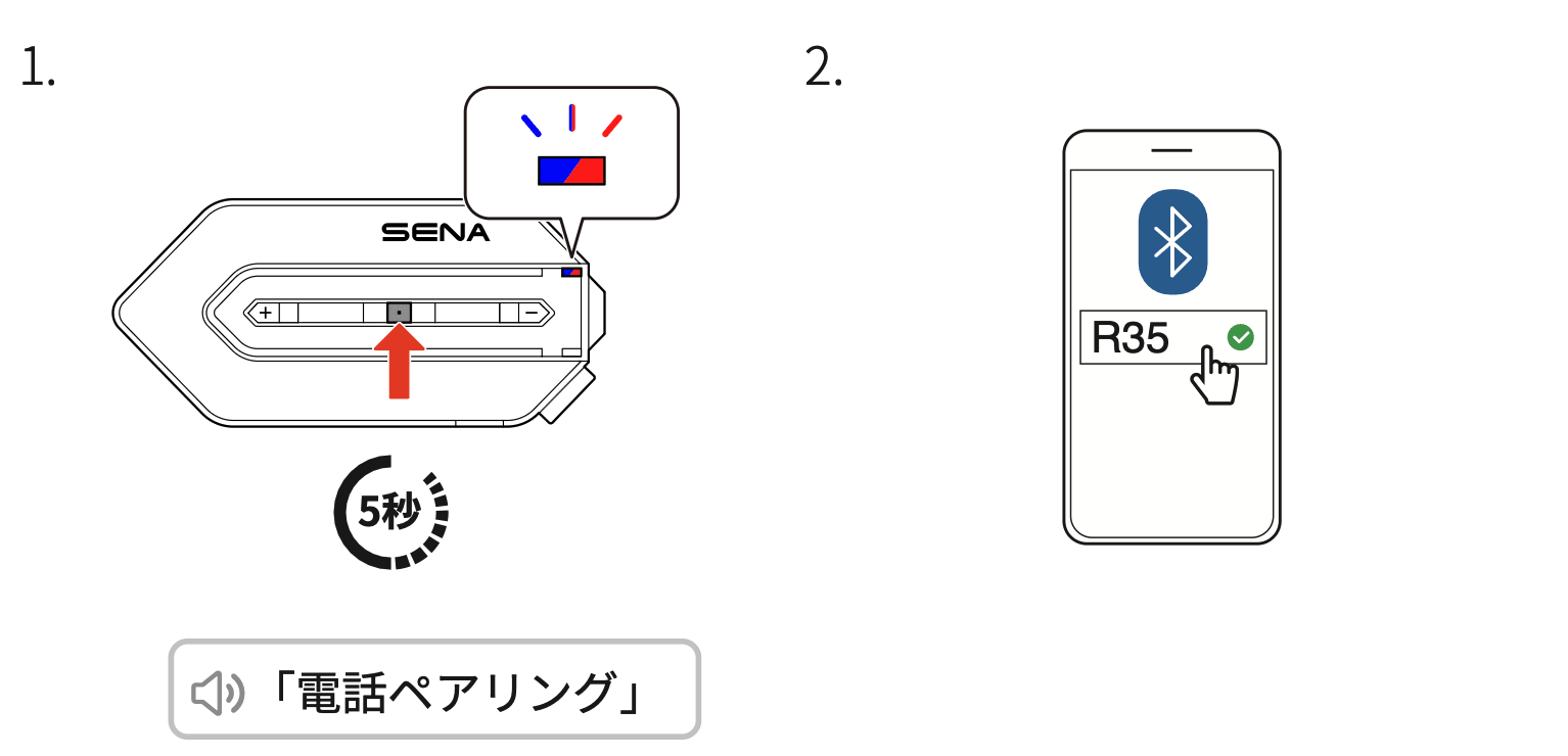 R35がアイドリング状態の時に、センターボタンを5秒長押しすると、電話ペアリング開始します。