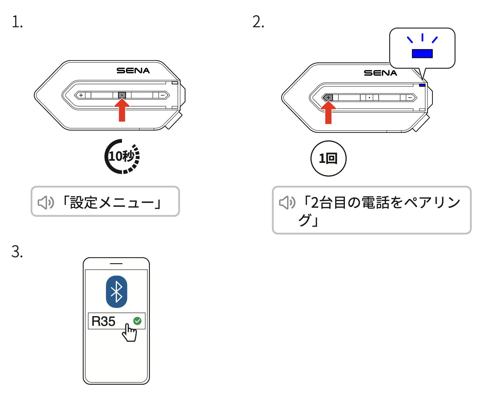2. +ボタンを1回タップするとメニューが移動、「2台目の電話ペアリング」という案内が聞こえ、ペアリングが開始足ます。