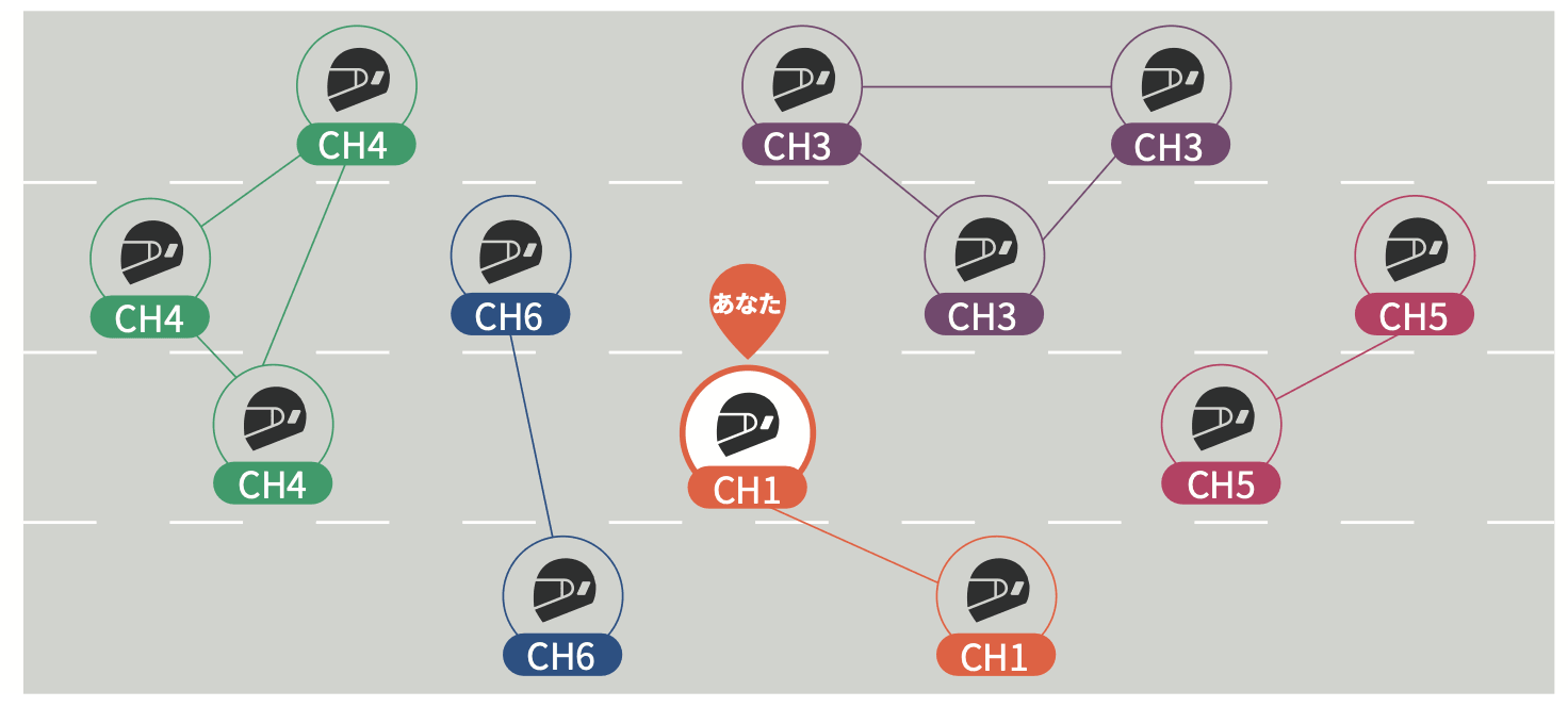 ボタンをタップするだけで、すぐに誰でも参加できる、いわば「オープンチャット」のようなモードです。同じチャンネルにいる他のライダーがいれば、自動的に接続されて会話に参加できます。ツーリング中に、たまたま近くを走っていたライダーとも気軽に会話できるのが特徴です。6チャンネルを切り替えて運用できます。