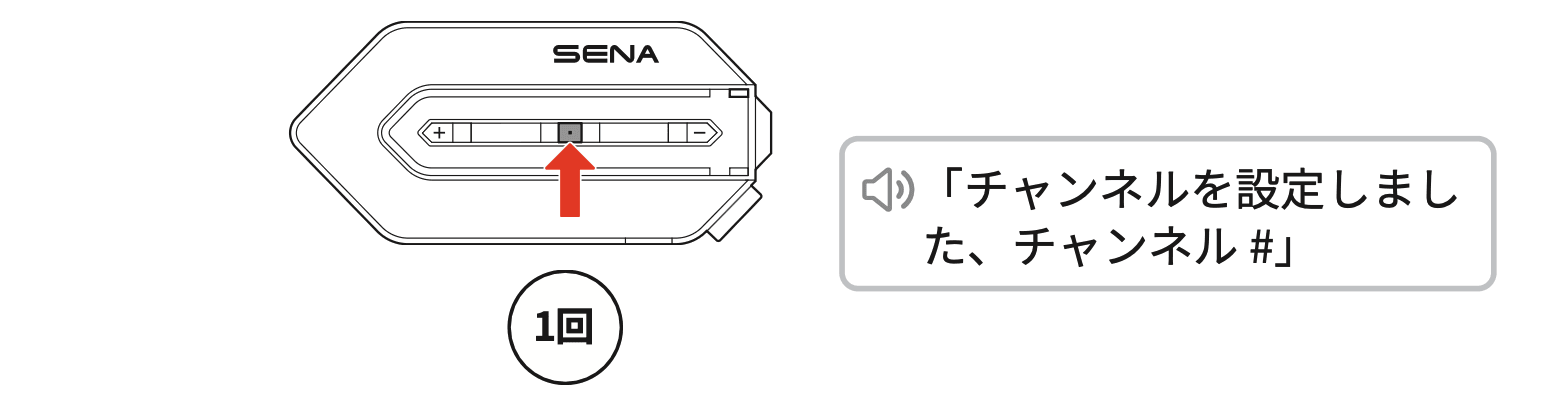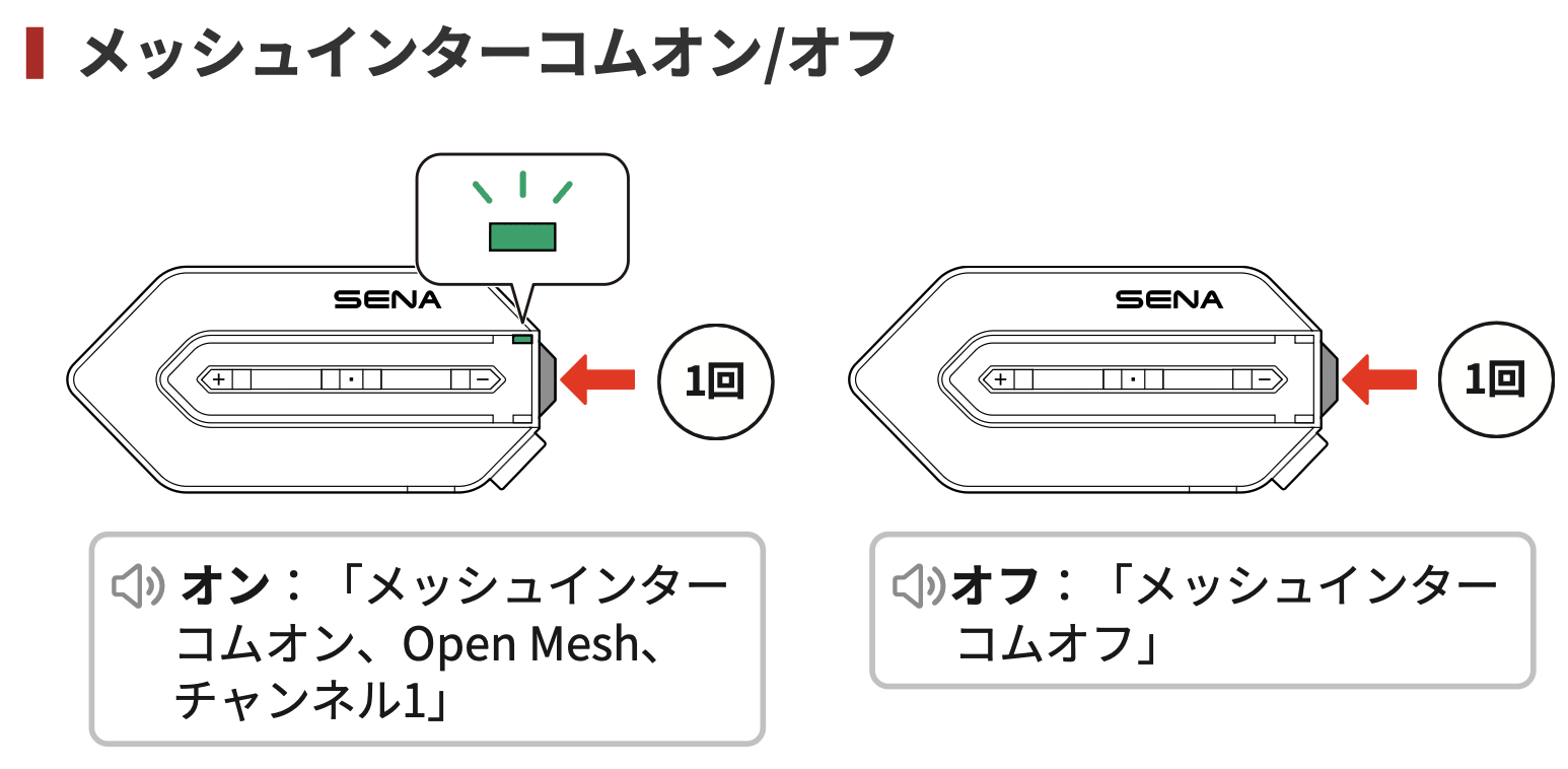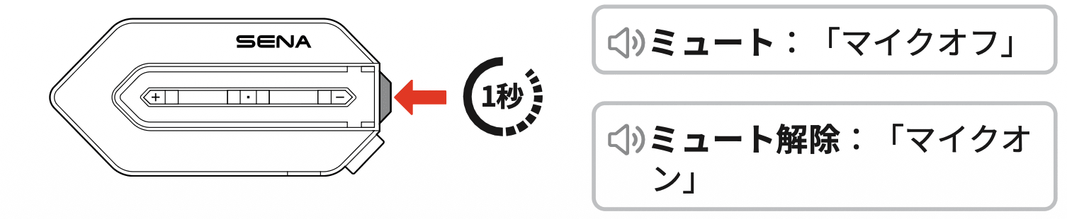 メッシュインターコム通話中に、自分のマイクをミュートするには、メッシュボタンを1秒長押ししてください。ミュート解除もメッシュボタンを1秒長押しします。