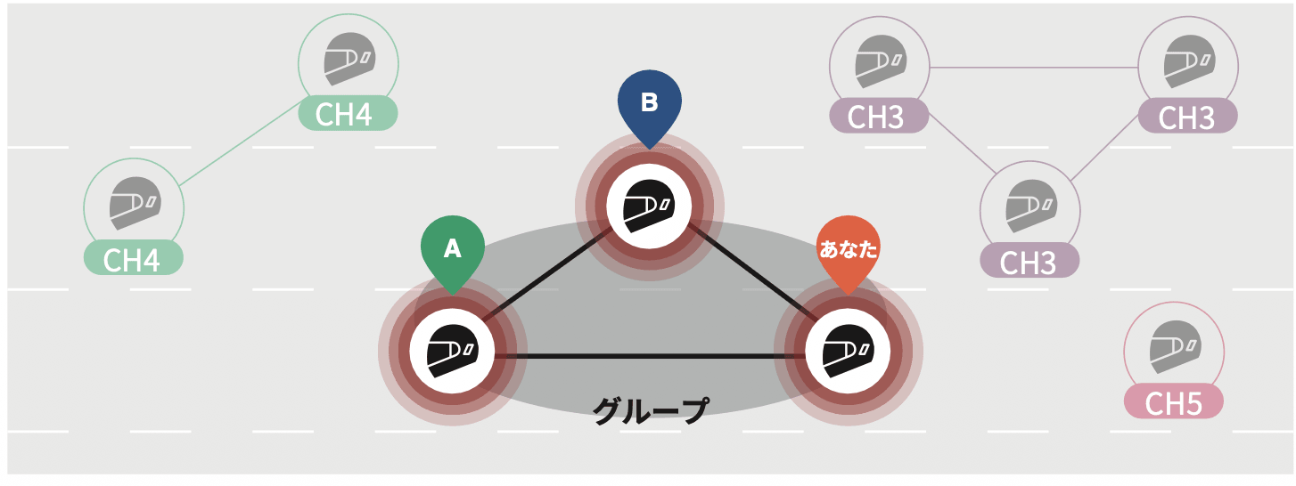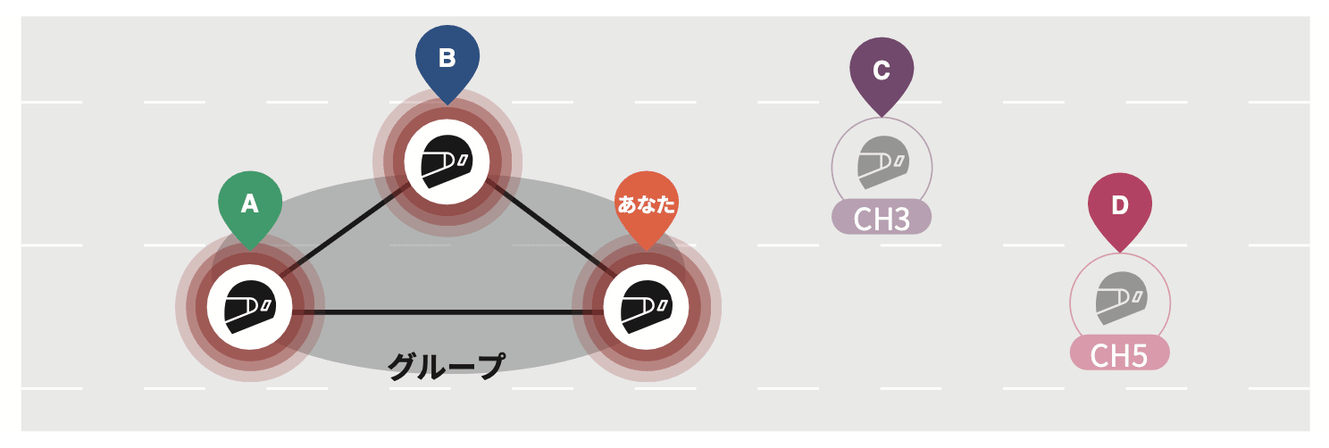 事前にグループを作成したメンバー同士でしか会話できない、いわば「プライベートチャット」のようなモードです。ツーリング仲間など、特定の人たちとだけ会話したい場合に便利です。