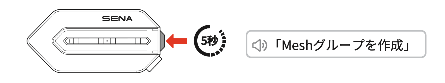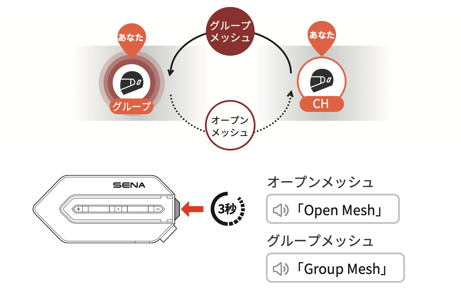 グループ作成後も、メッシュボタンを3秒長押しすることにより、オープンメッシュとグループメッシュのモードを自由に切り替えることができます。
